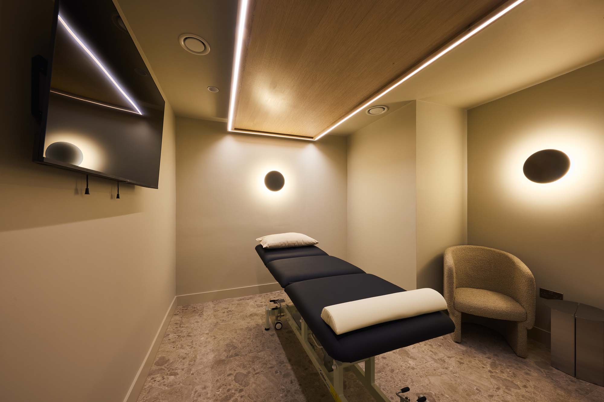Overlooking Tower Bridge and the Tower of London, our St Katharine Docks treatment room offers a calm, private setting for both clients and practitioners. Located moments from Tower Hill station by the marina, the space is fully equipped with an electric treatment bed, massage gun, sink, and essential amenities.